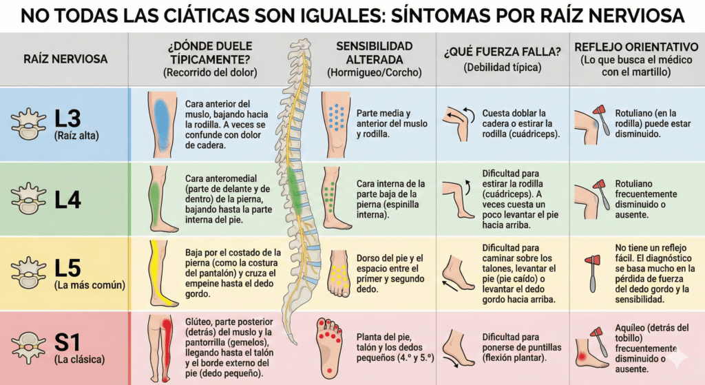 Nota importante: esta tabla orienta, pero puede haber solapamientos, sobre todo si hay estenosis en varios niveles o más de una raíz afectada. Además, los patrones pueden evolucionar con el tiempo en algunos pacientes.¹