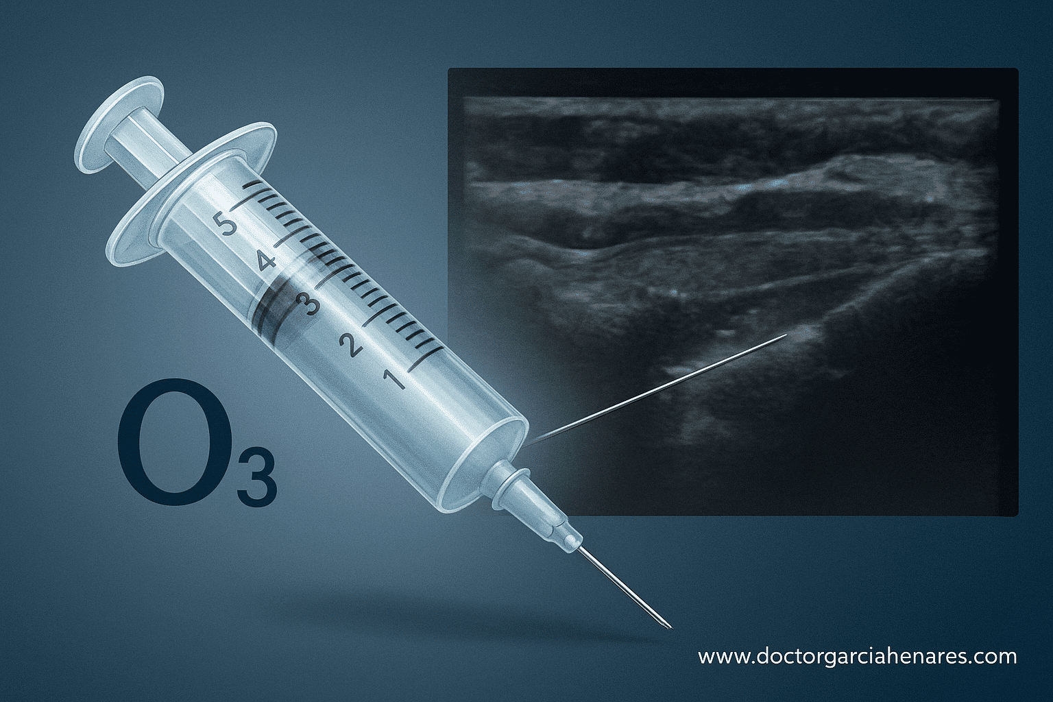 - Ozonoterapia Intradiscal: Actúa reduciendo el volumen herniado mediante la degradación de los proteoglicanos y, fundamentalmente, ejerciendo una potente acción antiinflamatoria y antioxidante que neutraliza los mediadores químicos que irritan el nervio.